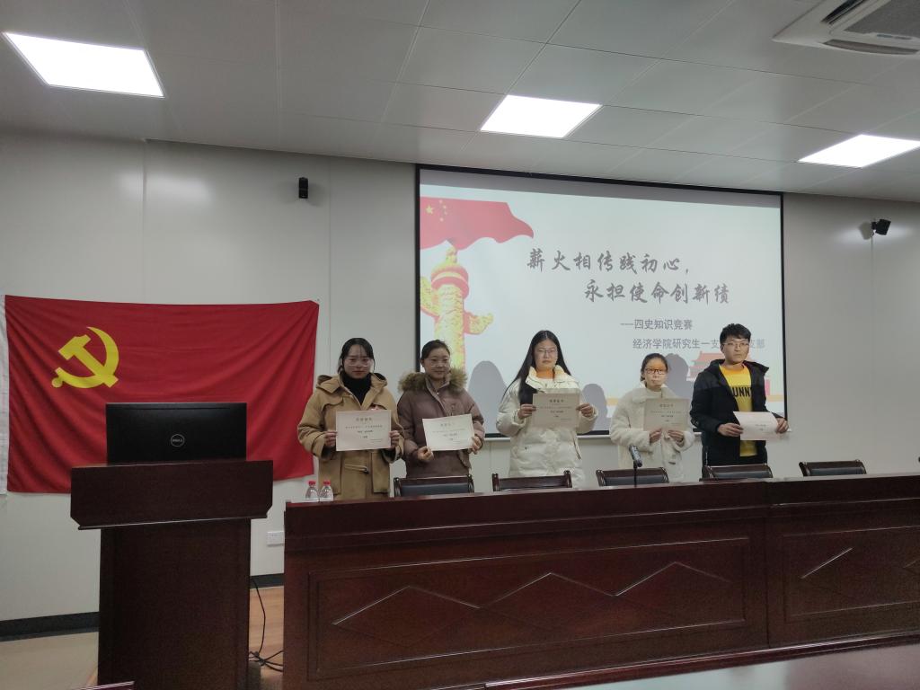 研究生一支部并二支部共56名同学参与了此次活动。同学们下午13:00时在图书馆门前集合,而后分成四队,前往南京解放革命斗争遗址、六朝建康古都遗址、南京民间抗日战争博物馆、雨花台烈士陵园四个红色旅游景点进行参观。知识竞赛于晚18:30-20:00在德经楼307开展,三支参赛队伍由研究生两党支部推选代表组建而成。本次“四史”主题知识竞赛共分为小组必答题、小组抢答题和风险抢答题三个环节,以积分制的形式逐出名次。党员同学们一个个你追我赶、不甘示弱,对党史、新中国史、改革开放史、社会主义发展史都有较好的理解和掌握,场上竞争十分激烈,三队同学分别获得卓越青年奖、精神文明奖、思想进步奖。活动最后进行了各队的颁奖和合影环节。