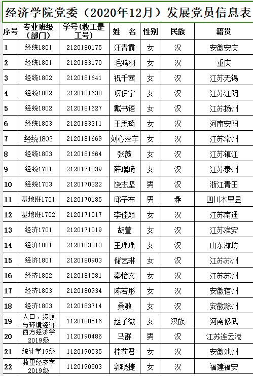 根据《发展党员工作实施细则》有关规定,经学院基层党支部考察、学院党委预审,拟接收汪青霞等22名同志为中共预备党员。现将名单予以公示: