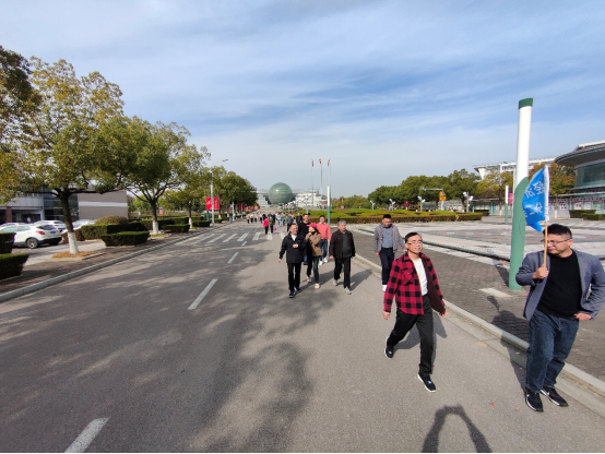 中午一点钟,在院党委书记张圣兵教授和院长朱红根教授的带领下,学院五十余名教职员工从学校图书馆门前出发,经过校南大门,向北经北门后折返,最后达到终点德经楼。