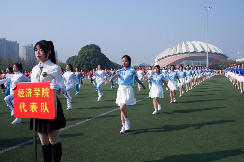开幕式上,qmh官网方阵的同学们神采飞扬、意气风发,他们迈着整齐的步伐,喊着响亮的口号踏步入场,充分展现出经院学子饱满的精神和昂扬的斗志。他们身上的蓝色服装,是瞄准胜利、超越自我的冷静与执着的象征。整齐划一的动作,笑意盈盈的脸庞,参与广播体操表演的同学们,用青春书写了球盟会qmh网址最美的模样,彰显了经院学子的青春魅力和体育精神。