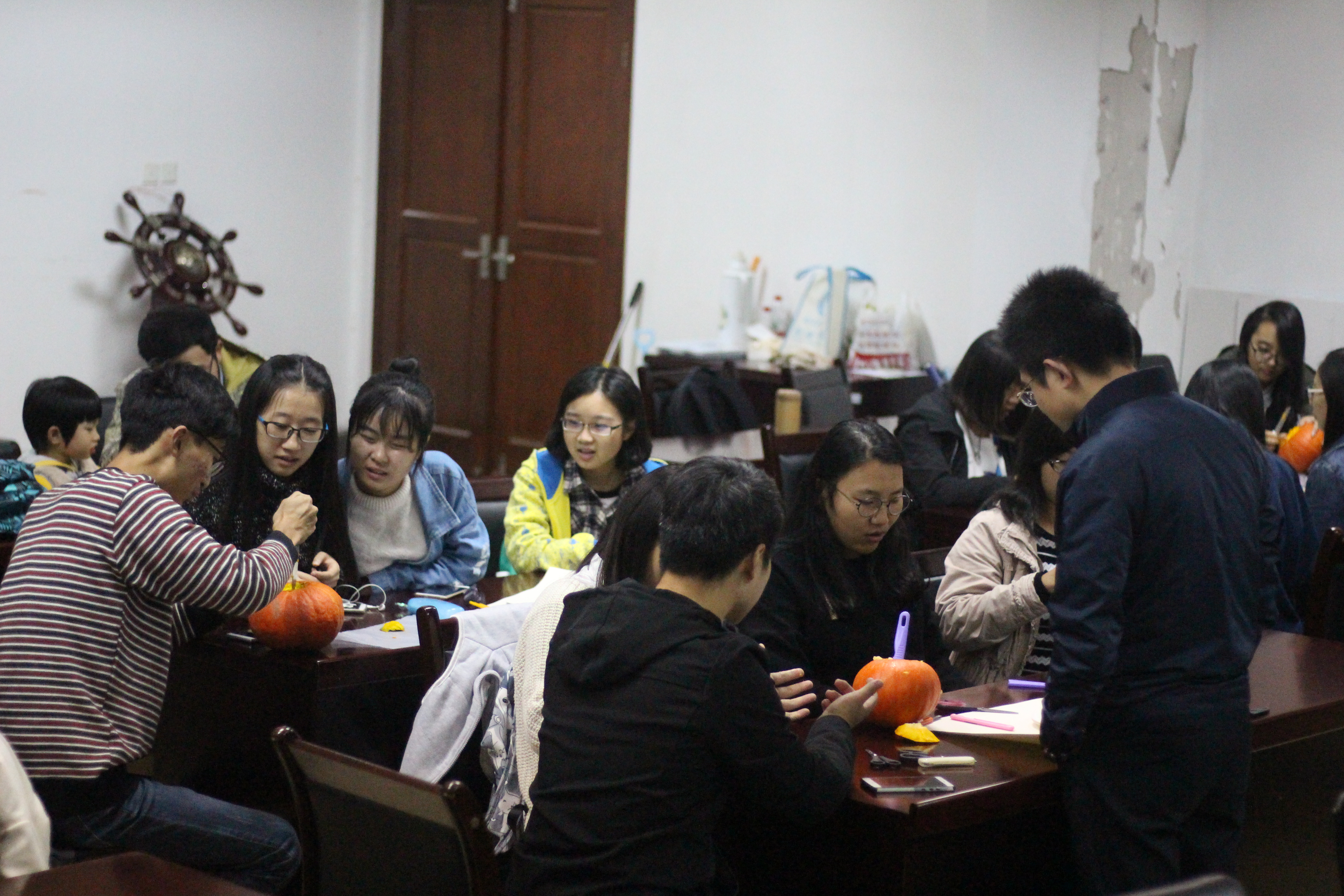 每年的11月1日是西方的万圣节,为了迎合万圣节的气氛,10月30日晚,qmh官网英语角的师生们在经济学科楼307室举办了制作南瓜灯活动。qmh官网外教Jeffrey Smith在现场指导制作,经济系系主任周绍东老师也带着家人参加了该活动。