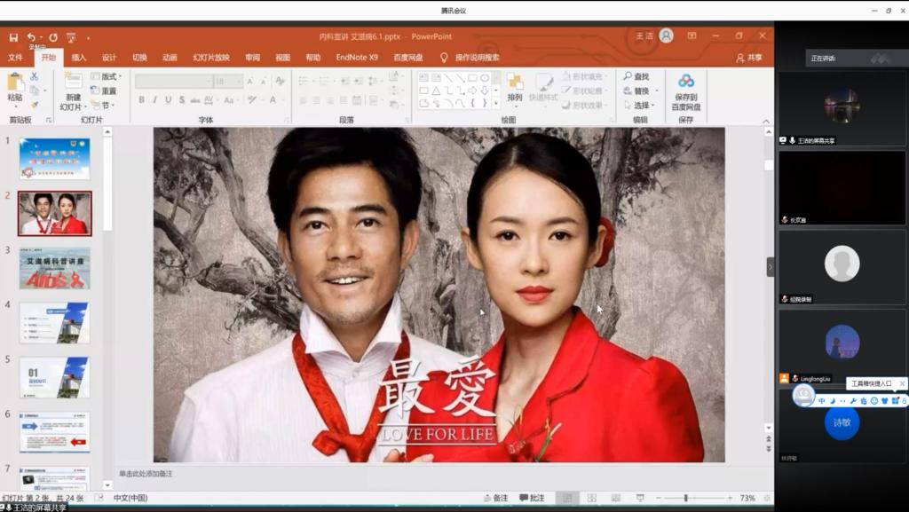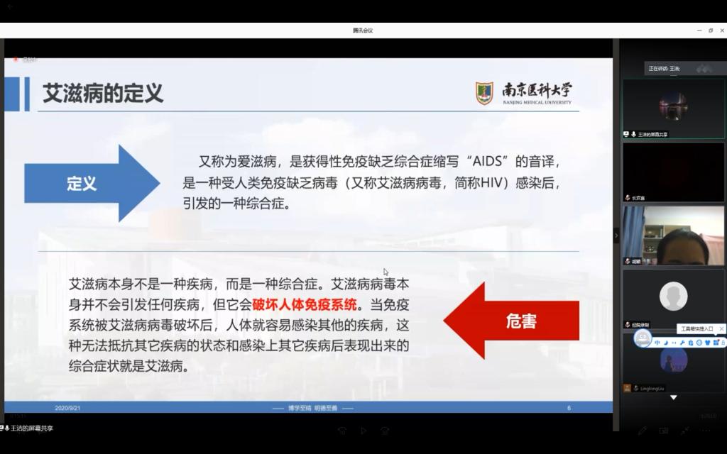 主讲人以电影《最爱》中的情节引入,从基础知识、临床表现、传播途径以及预防和治疗四个方面较为全面的科普。她特别指出,除了性传播、血液传播、母婴传播这三大主要传播途径外,其他的生活接触如握手、拥抱、吃饭、使用公共设施等一般不会感染艾滋病,呼吁同学们不要谈“艾”色变。对于艾滋病的预防和治疗这一知识盲点,主讲人给大家提出了系列具体可行的建议。主讲人的讲述结束后,有同学在线提问,“为什么蚊虫叮咬不会传染艾滋病毒?”“艾滋病毒阻断药物的最迟使用限制以及使用方法是什么”等等,宣讲团成员悉心解答。活动结束后听众们纷纷表示收获颇丰。
