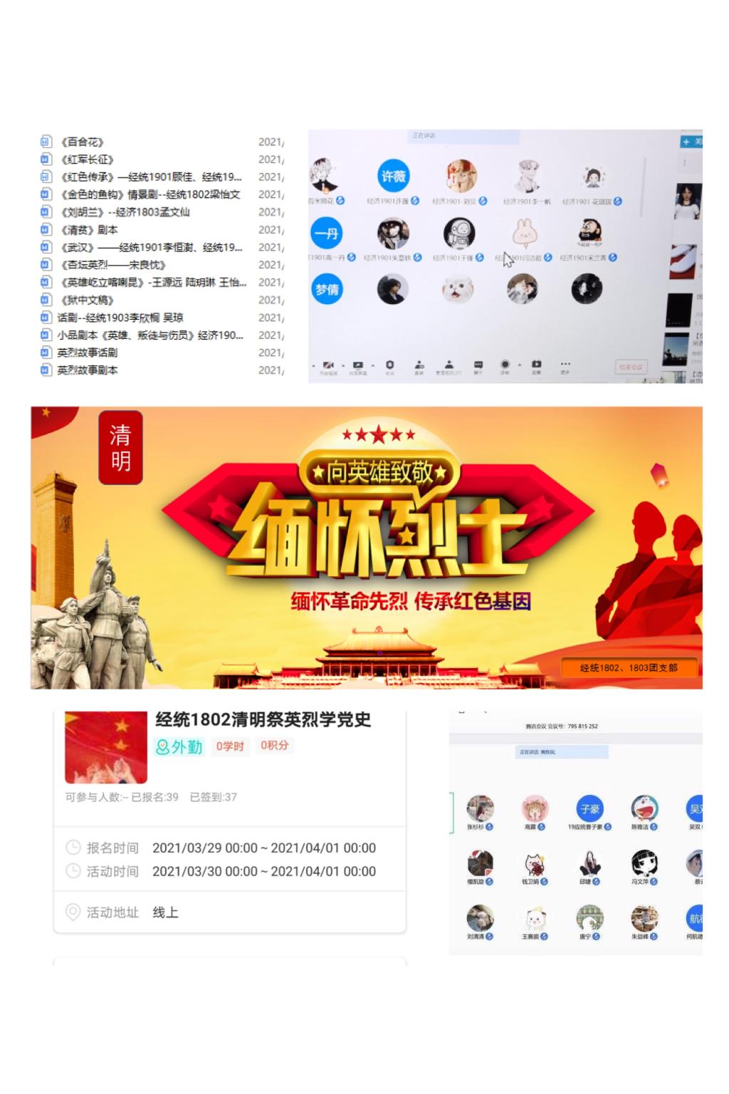 各团支部相继开展以“缅怀革命先烈、传承红色基因”“经典随行、做时代好青年”“清明追思 缅怀先烈”“红色基因代代传——清明祭英烈 共铸中华魂”为主题的团日活动。经统1802、1803团支部联合开展了网上祭英烈活动,通过网上献花、留言等方式祭奠先烈,表达敬意。经济2001团支部通过“挑战杯”红色专项活动的经验交流,分享了革命事迹和英雄故事,并在“时代青年承诺书”上署名以完成承诺,汲取奋发精神,传承红色基因。经济1901团支部、研究生团支部通过腾讯会议线上学习“四史”,分享革命事迹,缅怀抗日保家卫国的烈士们,交流心得体会,感悟祖国发展和日益强大的精神动力源泉。经济1902、经济1903团支部集中重温入团誓词,聆听革命故事,宣传英烈的感人事迹,将红色基因融入青年血夜。经统1903、经济2003团支部讲述革命英烈的先进事迹,缅怀先烈,发扬革命先辈的优良传统。经统2001团支部以集中观影的方式,重温老一辈革命家在风雨飘摇的年代里为国家赴汤蹈火的革命情怀,接受了深刻的革命传统教育和爱国主义教育。球盟会qmh网址分团委和学生会联合开展“传承红色基因、清明云祭英烈”线上主题学习会,以“云”祭奠的方式,缅怀为民族独立,为人民解放抛头颅、洒热血的革命英烈,追思那些为正义事业逝去生命的英雄。同学们纷纷表示要牢记革命先烈的伟大功绩,继续发扬革命先辈的优良传统,传承红色基因,缅怀先烈,勇立时代潮头、争做时代先锋。