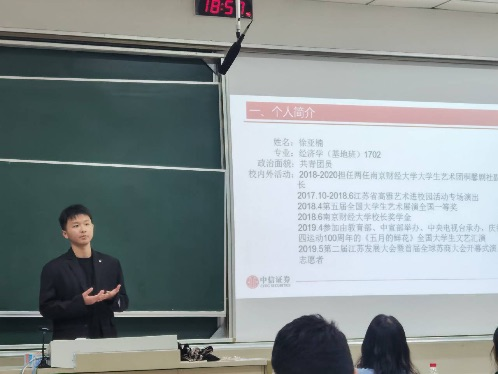 接着,徐亚楠学长介绍了自己选择就业这条路的心路历程。选择很重要,如果一开始不能明确自己要走哪一条路,那一定要学会给自己留后路。她强调了大学生做职业生涯规划的重要性。他以秋招形式,秋招流程为引展开关于就业背景的讨论,并结合自身在求职时的经历,为大家分享了求职过程中在简历制作、面试技巧、发展前景等方面的经验技巧。分享申请中信证券职位与面试中的经验,提出要注重信息收集,不要错过一些重要的时间点和一些申请机会。另外他告诉同学们,招聘机会也不局限在校内,还可以尝试通过自己了解到的渠道去获得。除此之外,叮嘱学弟学妹们要会调节情绪,不要长时间陷入焦虑,鼓励大家要更加自信,做好自己,同时还应积极尝试,不要畏惧失败,抓住一切存在可能性的机会。