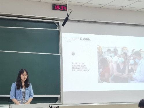 首先,甘雨菲先介绍了自己在选择未来道路时的感受,如何更好地定位自己和制定清晰的目标。她分享了自己在申请英国曼切斯特大学的经历,从个人情况、出国要求条件、出国流程讨论、提升自我四个方面为大家介绍了自己在申请出国留学方面的经验,针对出国留学的规划、雅思学习备考的经验,对申请学校材料的准备包括简历、推荐信、个人陈述等方面做了详细介绍,建议有出国意愿的同学在时间允许的情况下自己申请。她鼓励同学们要在在校期间多参加各种社会活动与实习,丰富个人经历背景。