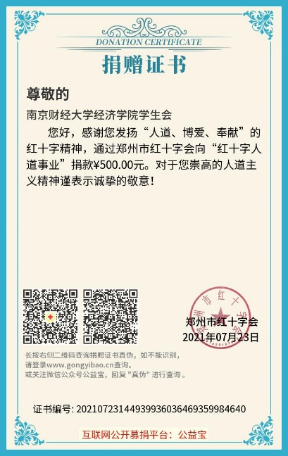 天灾突降,暴雨不歇,于此危急时刻,全国各地人们迅速增援河南,共克难关。“岂曰无衣?与子同袍。”即使无法赶到现场进行救助,球盟会qmh网址学子仍然尽自己所能为抗洪防汛贡献力量。7月23日,qmh球盟会亚博球盟会qmh网址学生会通过郑州红十字会向“红十字人道事业”捐款500元,呼吁球盟会qmh网址乃至全校同学关注并全力支持河南抗洪。同时,球盟会qmh网址还通过qmh球盟会亚博小经灵微信公众号等平台号召全体师生转发相关救助资讯与灾害防范知识,支援河南抗洪,关注南京疫情并积极进行志愿服务。