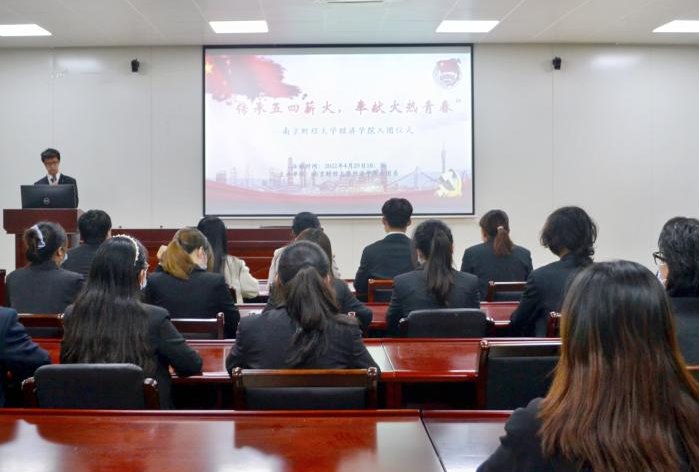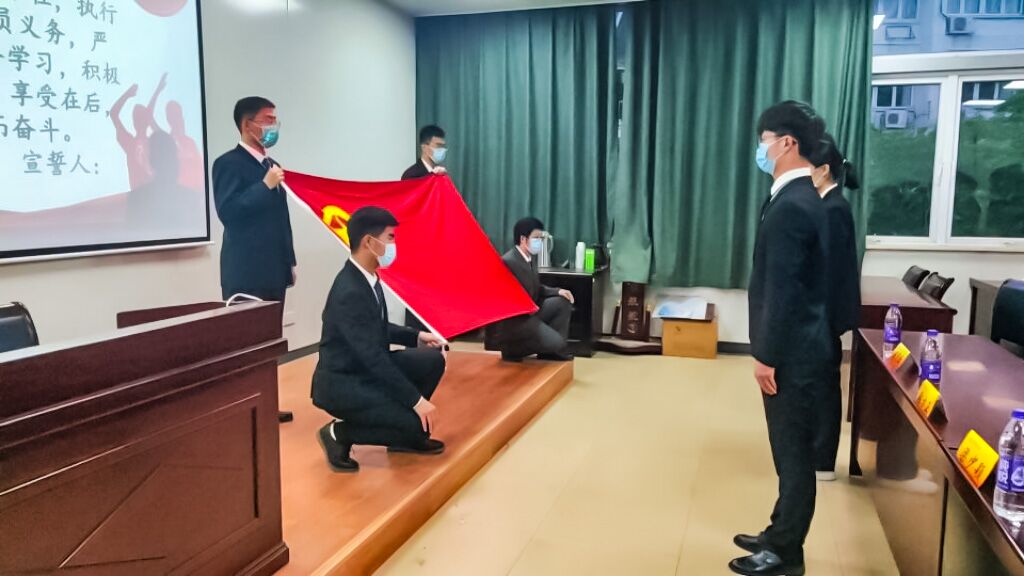 活动在雄壮的国歌声中拉开序幕,主持人徐宇恒宣读了2022年新发展团员名单,并对入团仪式的意义作出诠释。主持人指出,五四青年节源于1919年5月4日以青年学生为代表的爱国运动,青年意味着责任,入团则意味着带头尽责,每一位青年团员都应铭记先辈们用青春和热血谱写而成的伟大征程,立志成为一名合格的优秀的共青团员。随后,qmh官网分团委书记潘怡老师来到台前,将团章与团员证郑重递与两位新团员,并亲自为他们佩戴好团徽。紧接着,分团委副书记张方正带领大家进行入团宣誓,两位新团员语气满是坚定、誓言饱含热情,他们所佩戴的团徽在他们的胸前闪闪发光,共青团员的担当与责任也从此在他们心中闪耀。