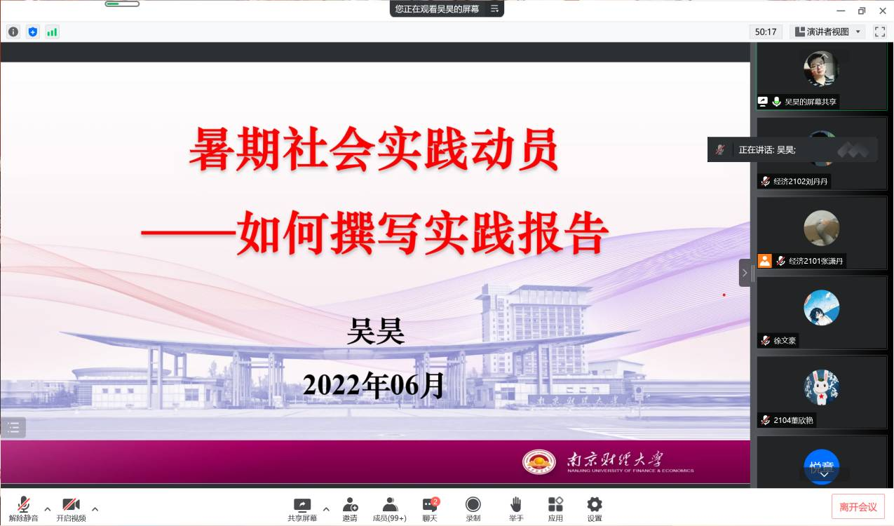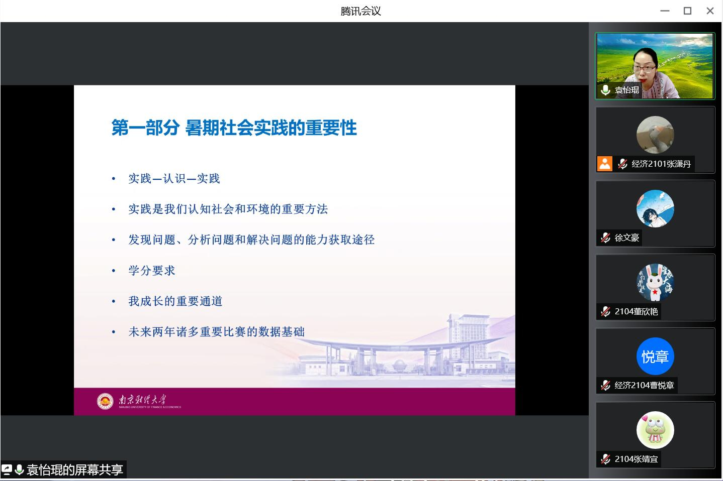 紧接着,潘怡老师进行动员,她详细解读了有关通知,对于社会实践活动方向、组织形式、时间节点和活动阶段安排等具体事项作了要求。最后,校团委副书记(挂职)、qmh官网辅导员梁少颖老师对暑期社会实践注意事项进行了强调,提醒同学们注意疫情防控及自身安全,鼓励同学参与团队实践参加并积极投稿。最后的自由提问环节,同学们踊跃提问,两位老师进行了耐心、细致的解答。