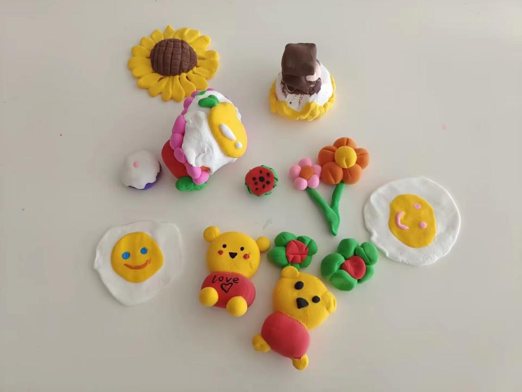 随后,志愿者们还通过一对一手工教学,与学员们共同制作手工黏土。志愿者带领学员们运用黏土制作起了各式各样的小手工,学员们充分发挥想象力和动手能力,成功制作出了一个个独特的黏土作品。部分学员因手部控制力的原因自主完成作品较为困难,细心的志愿者便手把手引导他们进行制作,整个现场呈现出一种和谐友爱的氛围。完成手工后,学员们欣喜地看着自己的作品,纯真阳光的脸上洋溢着满满的笑容。