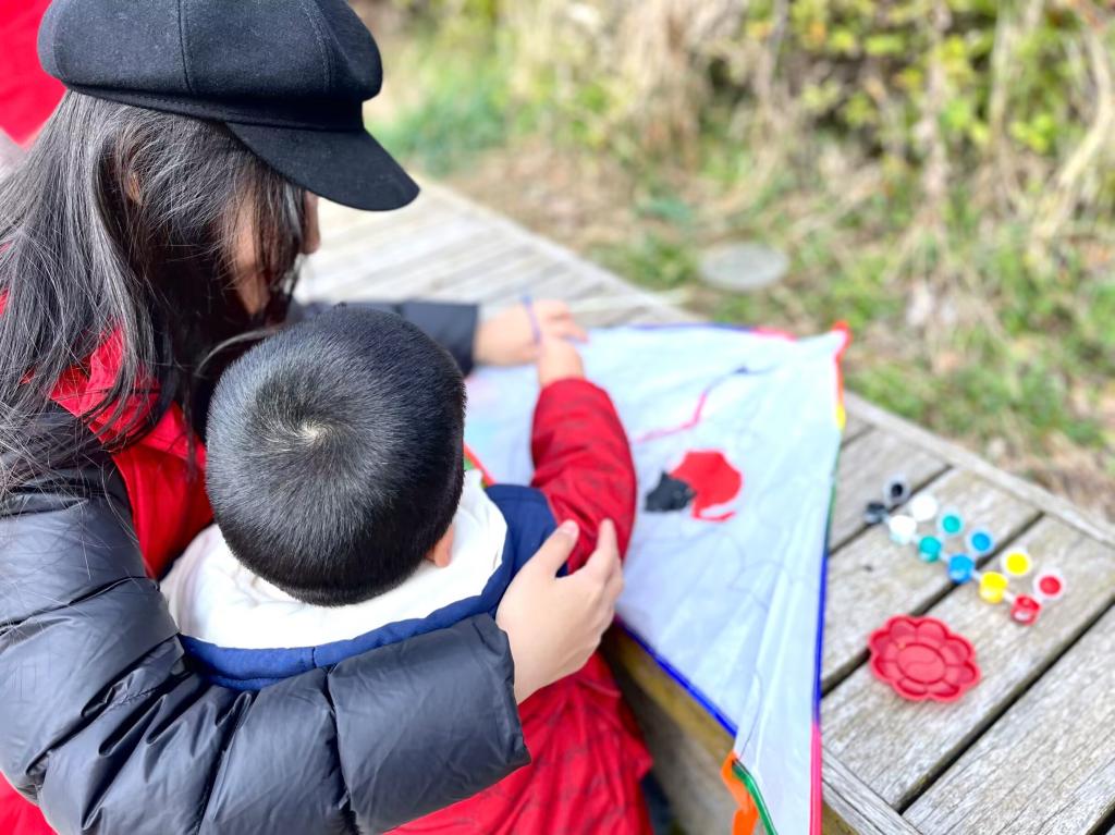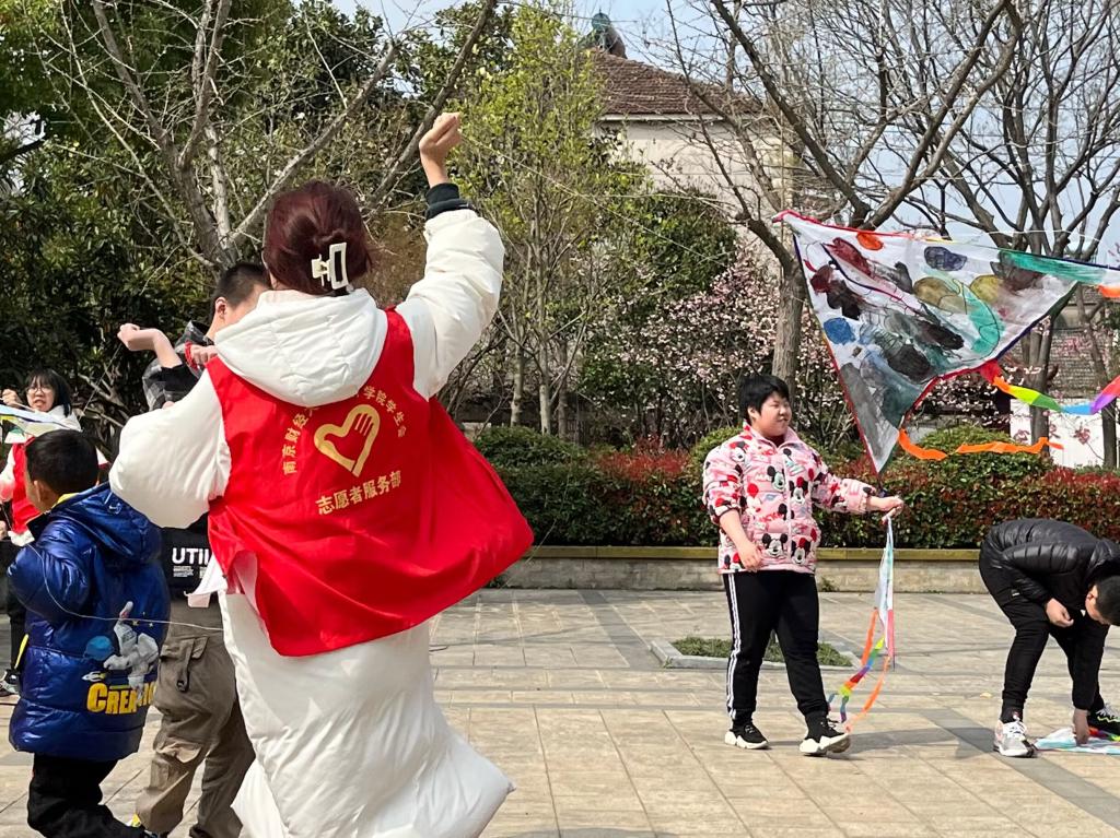 经过近两个小时颠簸的车程,志愿者们来到了钱洁语言康复中心。在老师的带领下,孩子们蹦蹦跳跳地走向广场。志愿者们根据老师的安排和孩子们的意愿,一对一带领孩子们为风筝涂色,孩子们努力地向志愿者们表达自己的想法,志愿者们也耐心地用语言或手势鼓励孩子们完成作品。正值天气晴朗,微风吹拂,孩子们绘制完多彩的风筝,志愿者们便带领孩子们在广场上放飞风筝。各色各样的风筝随风腾起,越飞越高,孩子们也在广场上雀跃欢呼起来。他们当中有的调皮,有的腼腆,有的拿到风筝就迫不及待地比划,有的向志愿者讲述着作品的灵感来源,更有的为志愿者竖起了大拇指……或许因为身体原因,孩子们的校园生活暂时搁浅,但他们努力克服语言障碍,拥抱属于他们的青葱岁月。活动结束离别时,孩子们已全然没有了刚开始的陌生感,而是依依不舍,热情相拥。这一刻,温暖涌动、爱心相印,令人难忘。
