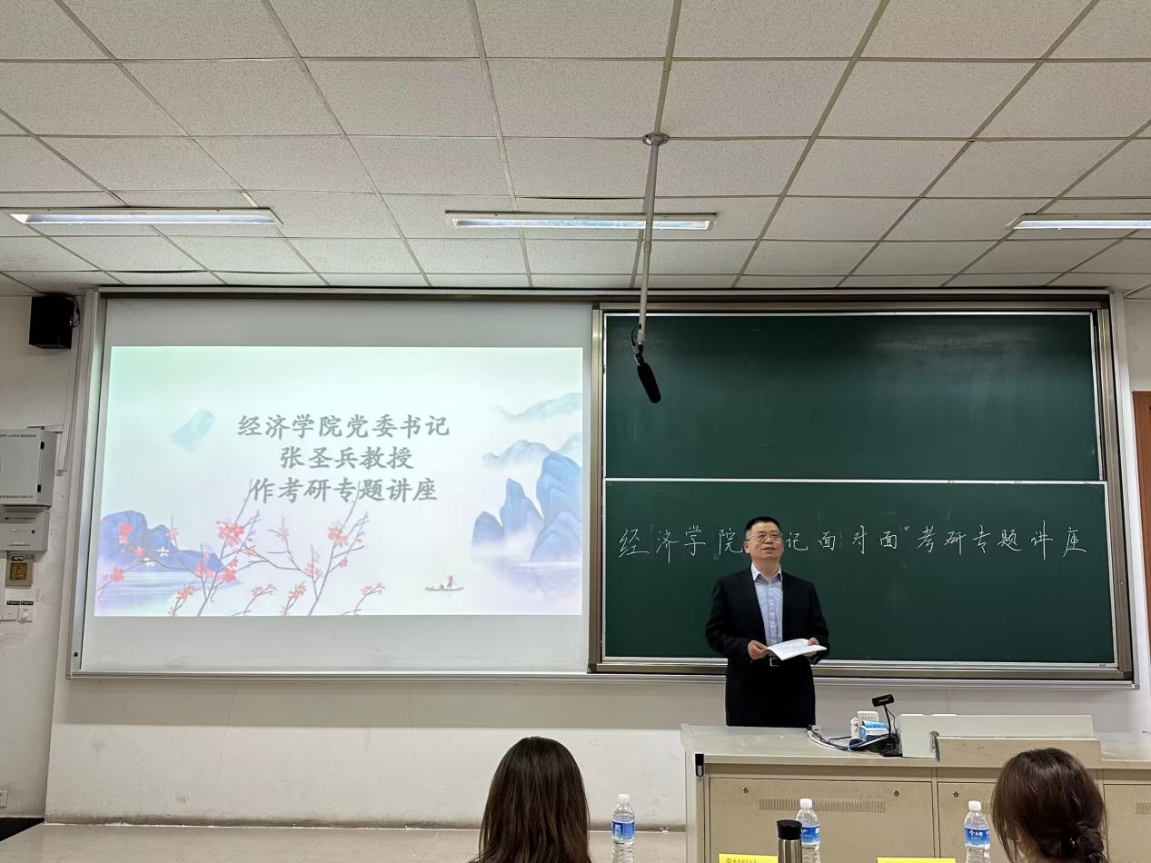 随后,党委书记张圣兵教授从考研选择、复习备考、就业择业等方面作考研专题分享。他结合自身经历,讲述了自己从北京师范大学政治经济学本科毕业后投身工作,而后又到北京大学球盟会qmh网址助教进修班进修,最后又作为北京师范大学经济学博士毕业的求学之路。张圣兵书记鼓励同学们积极考研升学,引导同学们明确人生道路选择,充分了解升学就业趋势,为自己提供更高的发展平台。