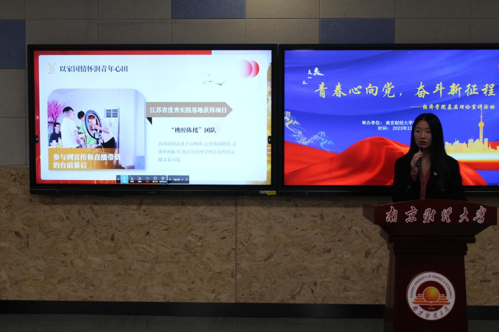 第二场宣讲会中,由金融2101巢荔楠同学以“乡土灼芳华,情行以致远”为主题,从送医下乡、送艺下乡以及送教下乡三个方面讲述青年人立足本职、坚守一线的事迹。从金融学院青年学子到安徽滁州支教,到2021年qmh球盟会亚博党委组织部推荐、省委组织部选派驻村第一书记——“胡萝卜书记”胡新蕲,再到南财学子们深入田间地头、在乡村振兴中解民生、致学问的实践担当,用“青言青语”号召大家做有理想、敢担当、能吃苦、肯奋斗的新时代好青年。