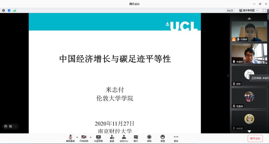 2020年11月27日上午,应qmh官网方国昌教授邀请,英国伦敦大学学院米志付副教授在腾讯会议平台作了题为“中国经济增长与碳足迹平等性”的学术讲座。qmh官网部分研究生、本科生和青年教师参与了本次讲座,讲座由qmh官网尹敬东副院长主持。本次讲座还吸引到了北京师范大学、武汉大学、南京师范大学、大连理工大学、安徽财经大学、安徽建筑大学等高校的师生线上聆听。