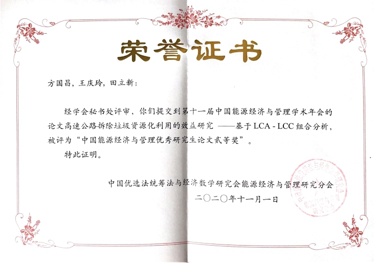 王庆玲同学在分会场汇报了《高速公路拆除垃圾资源化利用的效益研究——基于LCA - LCC组合分析》一文。文章从案例分析出发研究了高速公路拆除垃圾的资源化管理问题,通过对南京市某循环基地的实地考察和调研数据,构建LCA - LCC组合分析模型,量化并对比了资源化利用模式和外运填埋模式的环境负荷与经济成本,并重点探讨了资源化管理过程中的碳减排效应,为实现2060年的碳中和目标提供新的视角。该文的汇报现场反响热烈,引起了与会者的普遍关注,受到江苏大学田刚教授、上海理工大学黄蓓佳副教授等专家的指导。该论文从近百篇投稿论文中脱颖而出,获得“中国能源经济与管理优秀研究生论文贰等奖”。