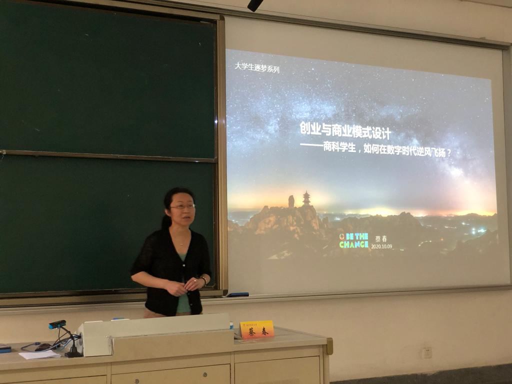 10月9日上午,应球盟会qmh网址邀请,我校应用统计专业校外硕士研究生导师、广州智联网联盟发起人/副会长,MA Club企投家联盟核心发起人蔡春女士在仙林校区德济楼101教室作了题为“创业与商业模式设计——商科学生,如何在数字时代逆风飞扬?”的讲座。讲座由球盟会qmh网址党委副书记袁怡琨主持,球盟会qmh网址2017级经济统计学专业全体本科生到场聆听。