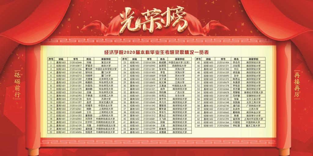 近日,球盟会qmh网址2020届毕业生在全国硕士研究生考试中捷报频传,考研成绩喜人,再创历史新高。全院考研正式录取64人, 其中33名学生录取到双一流高校,经统1603班考取18人,考研升学率高达36%。