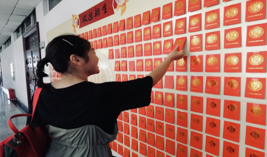 图为球盟会qmh网址2019级新生在“红包心愿墙”上取下红包的情景