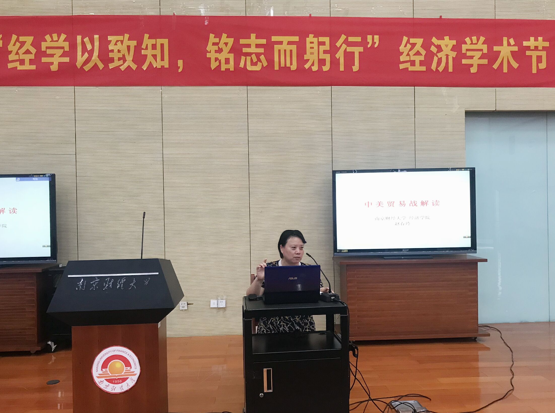 赵春玲教授作了题为“中美贸易战解析”的讲座,从中美贸易战原因、中美贸易的计算、中美贸易不平衡产生的原因、特朗普贸易战组合拳观察以及中美贸易战的实质五部分对中美贸易战进行解读。她由“301调查”事件切入,从全球经济一体化说起,介绍了“中国制造2025”和“301调查”等生动事例,分析中美贸易战对中美两国经济的影响。她还引入中美“打贸易战”时双方激烈的应对措施,并借助数据资料,带领同学们从经济学角度解读中美贸易战中相关的经济问题。