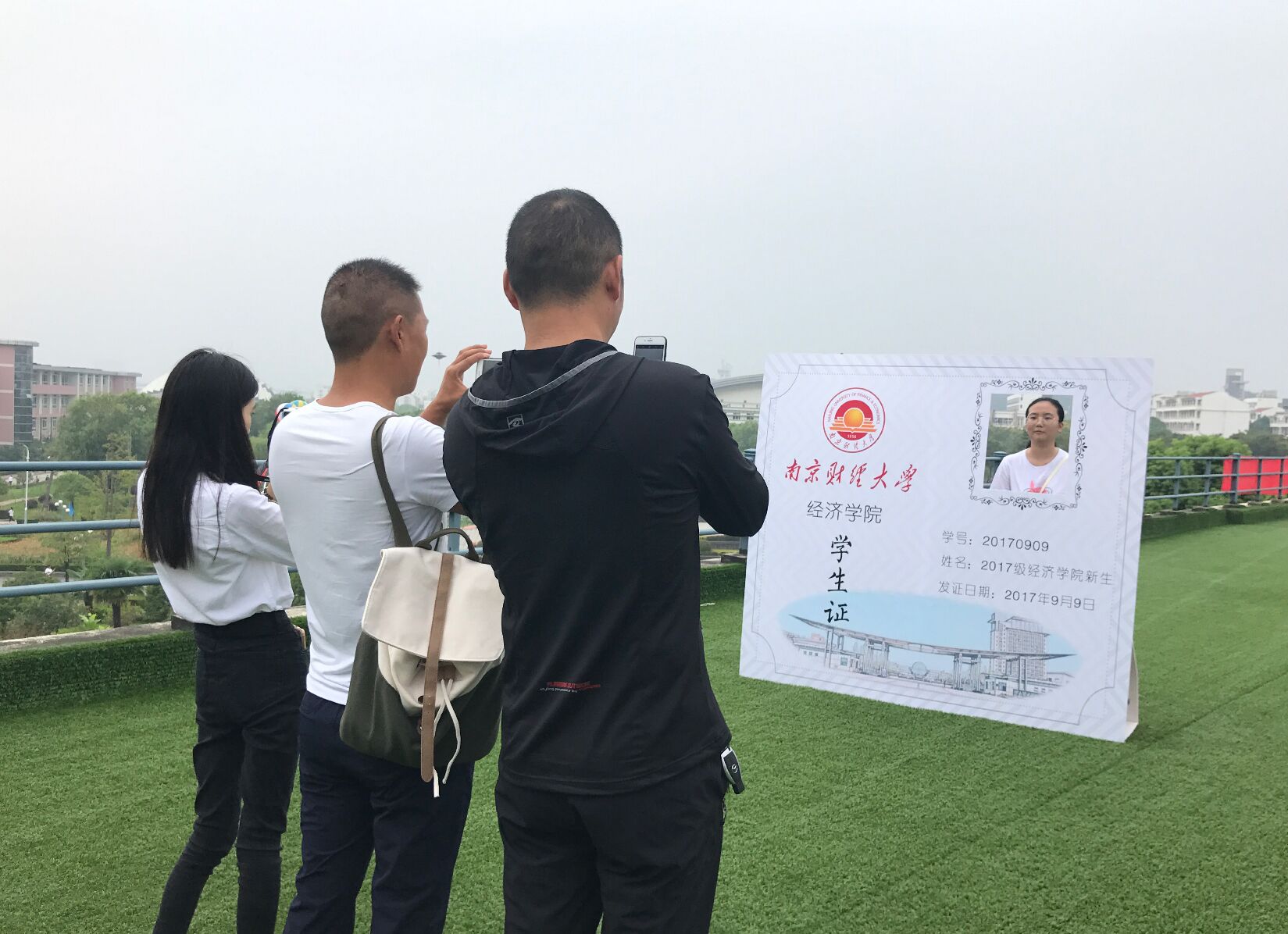德经楼三楼草坪上,qmh官网精心准备了特大号的“学生证”。新同学们以我校图书馆为背景,拍摄了第一张极具纪念意义的大学“学生证”。