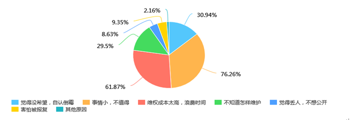 图1 南财大学生维权方式 值得一提的是,同学们难免会放弃维权。而对于放弃维权的原因,他们大多数认为事情小、不值得和浪费时间(见图2)。