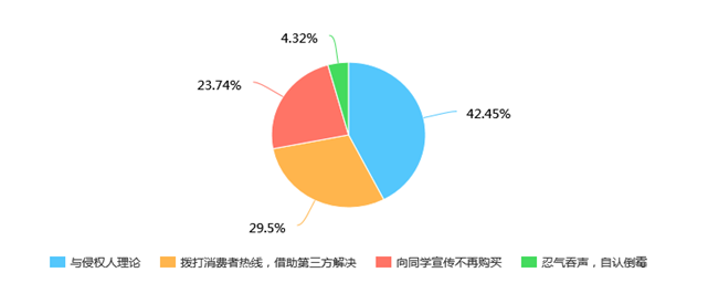 其中,权益受损其实并不是普遍现象。在调查中,有超过八成的同学表示偶尔才碰到权益问题。而他们大多数也会选择积极维权(近八成)。在维权的方式上,有近半同学会选择与侵权人直接理论,也有两成的同学会寻找第三方的帮助或向同学宣传不再购买(见图1)。