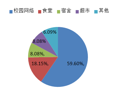 图2 南财大学生放弃维权的原因 大学生的校园娱乐生活的方方面面都关乎到他们的权益。校内同学的校园娱乐生活大致分为食堂、宿舍、超市和网络四个主要方面。结果显示,有59.60%的同学认为校园网权益最为关注。食堂紧随其后,占18.15%。而在宿舍管理和超市购物方面,同学们大多表示满意(见图3)。