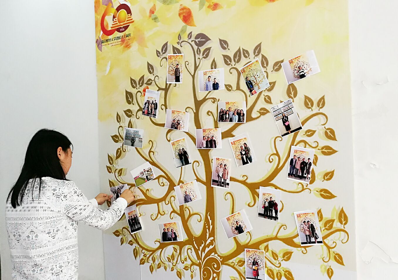 志愿者将校友照片贴在经院树上
