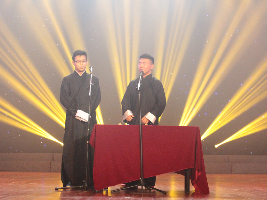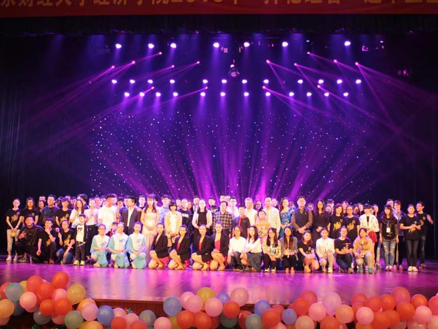 活力四射的探戈舞《libertango》随着摇曳的舞台灯光闪亮登场,也将晚会的气氛推向热烈。相声《大学这几年》,以幽默的口吻讲述了了大学四年来的生活、学习经历、感悟,在让人捧腹的同时,又耐人寻味。球盟会qmh网址特聘外教老师Jeffery Smith自弹自唱起自创的歌曲《Doctor Night Shades》,洪亮独特的嗓音丝毫不逊专业歌手,博得现场观众连连鼓掌叫好。古典舞《梨花瘦》由大四毕业生费越同学自编自排自演,舞蹈柔中带刚,仙气十足,令人沉醉。歌曲《默》也是由大四毕业生倾情演唱,唱出了大学四年对青春的执着。王庚老师一首《我的中国心》将晚会推向高潮,王老师与同学们一起高歌祖国,还寄语毕业生们要有一颗永远情系母校的赤子心。随后播放了精心拍摄的视频,即将毕业的大四同学们出现在视频中,公开说出了想说的话,共同回忆了有趣的故事。毕业班辅导员尹海燕与副院长陈耀辉(主持工作)也出现在视频中,给毕业生送上了最诚挚的祝福。台下,有人开始小声的啜泣,郝园园老师携着尹海燕老师五岁的女儿出现在舞台中央,合唱一首《手牵手》,稚嫩清澈的嗓音将全场气氛再次推向高潮,“我们将要面对未来的分离,请你牢记这段记忆,朋友我永远祝福你,人生一定有起落,但请不要伤心,我会在你身边,把我们的心放在一起,共同度过风和雨”……最后,晚会在合唱《仰望天空》中缓缓落下帷幕。