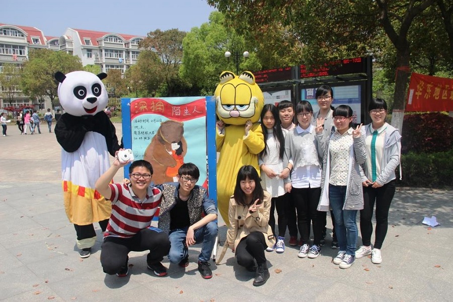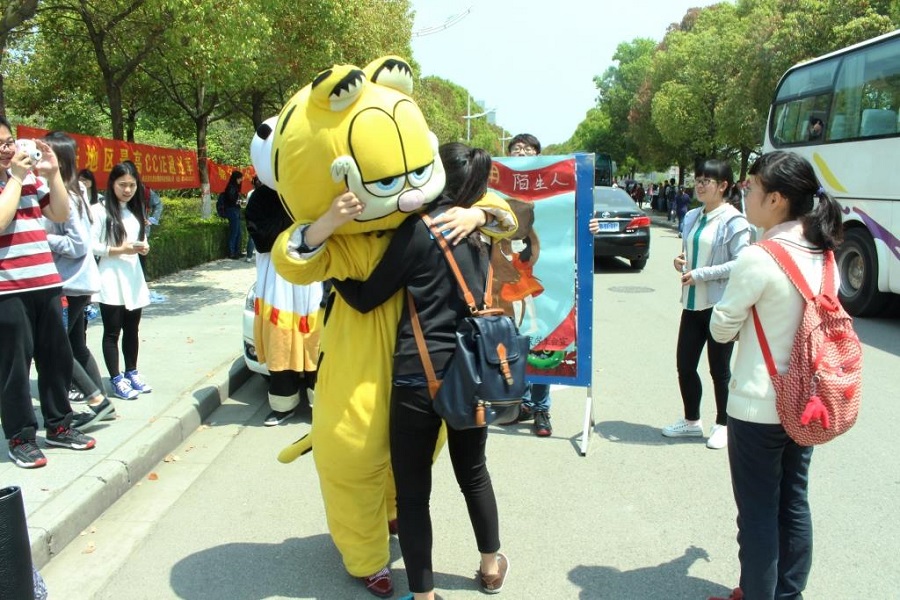 4月22日中午,由球盟会qmh网址学生会举办的“你好,陌生人”温暖校园活动在学校西苑举行。穿戴可爱玩偶服的志愿者们举着“亲,来抱抱吧”和“我可以抱你吗?”的牌子,给来往的同学们送上拥抱。一个个温暖的拥抱,让情感在彼此间传递。
