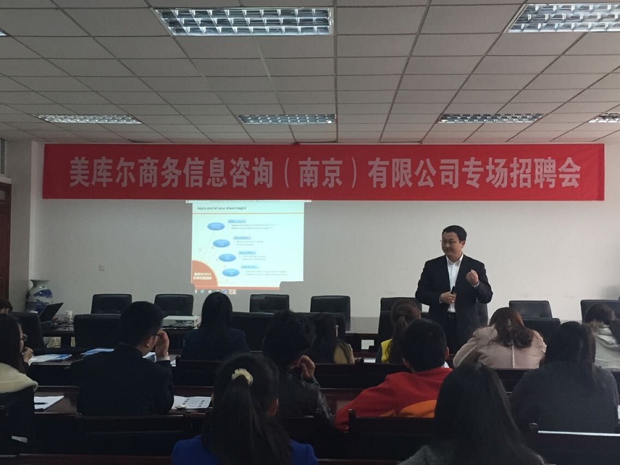3月26日下午,美库尔商务信息咨询(南京)有限公司校园宣讲会暨专场招聘会在qmh官网307会议室举办。美库尔上海分公司总经理张冀翔,南京分公司总经理秦宏,qmh官网院长陈耀辉教授,尹敬东教授出席了此次招聘会。