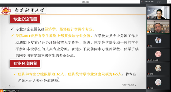 为了加深学生对学院本科专业的了解,帮助学生通过专业分流、方向班选拔选择适合自己的专业和方向,确保学院2021级本科生专业分流、方向班选拔等各项工作有序推进。学院于2022年4月29采用腾讯会议形式举办了“球盟会qmh网址2021级本科生专业分流宣讲会”。会议由学院副院长韩中主持,学院党委副书记袁怡琨,统计系主任程恭品、经济系主任陈杰、统计系王庚教授、经济系章莉教授、辅导员梁少颖、班主任吴昊、教学秘书陈祉岐以及学院部分教师和院内外2021级本科生参加了会议。