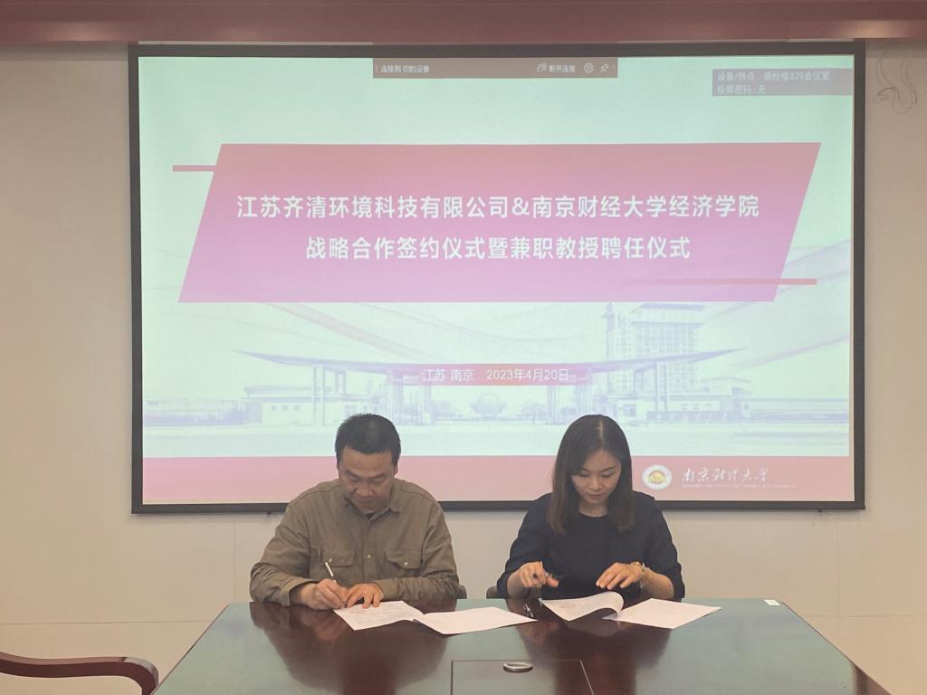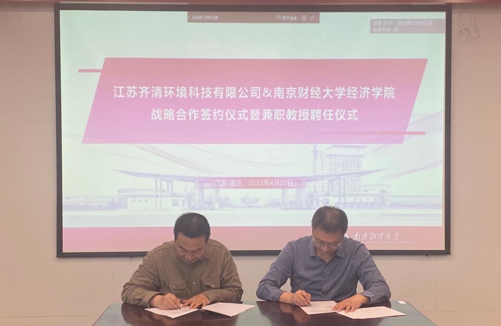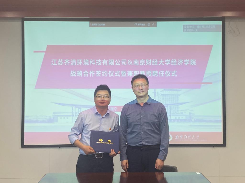最后,朱红根院长与王志良董事长签署了《qmh球盟会亚博球盟会qmh网址与江苏齐清环境科技有限公司战略合作协议》《qmh球盟会亚博球盟会qmh网址与江苏齐清环境科技有限公司实习就业基地共建协议》,并聘任王志良董事长、李建军副总经理为绿色经济发展研究院兼职教授。根据协议,双方将在碳经济与管理交叉学科人才培养、师资队伍建设,碳经济理论与实践研究,流域环境治理、生态环境政策咨询,实习就业基地建设等方面开展深入合作。