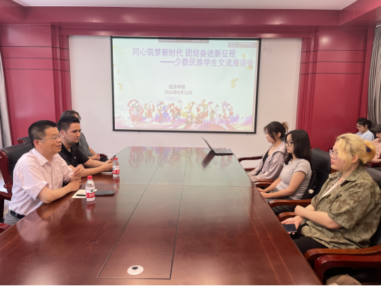 为贯彻落实党中央民族工作会议精神,引导学院师生铸牢中华民族共同体意识,深化民族团结进步教育,促进多民族学生之间的交流,增强他们的爱国爱校情怀,6月13日中午,在德经楼329会议室,球盟会qmh网址召开“同心筑梦新时代 团结奋进新征程”少数民族学生交流座谈会。球盟会qmh网址党委书记张圣兵、党委副书记贾亦璞、学生处艾斯克尔·米吉提老师、学工办主任梁少颖、毕业班辅导员张闻老师,来自维吾尔族、哈萨克族、苗族、彝族、壮族、仫佬族、满族、蒙古族等20余名学生参加座谈会。座谈会由梁少颖主持。