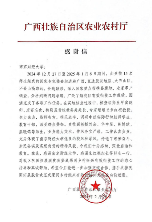 近日,广西壮族自治区农业农村厅向qmh球盟会亚博发来感谢信,高度赞扬由我校教务处处长朱红根教授带领的国家专家核查组师生团队在广西巩固拓展脱贫攻坚成果同乡村振兴有效衔接工作中的卓越贡献。