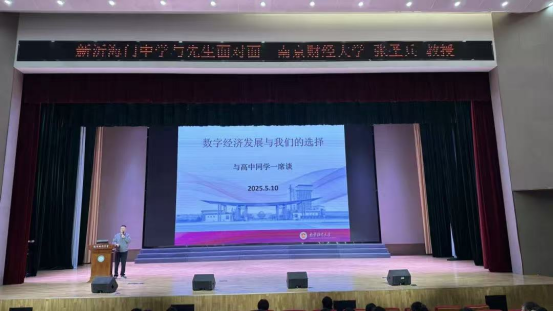 张圣兵书记一行随即来到新沂海门中学进行交流,双方各自介绍了学校的办学情况并就相关合作达成一致。5月10日上午,张圣兵书记应邀开设了题为“数字经济发展与我们的选择”的讲座,新沂海门中学校长王美华,副校长徐峰以及全体高二学生和家长参加了此次讲座。张圣兵书记向同学们介绍了不同职业的特点、发展前景以及所需的能力素质。从新兴的人工智能、大数据行业,到传统但不断创新的医疗、教育行业,丰富的职业信息让同学们大开眼界。讲座结束后,同学们纷纷表示收获满满,对自己的未来也有了更多的思考和规划。