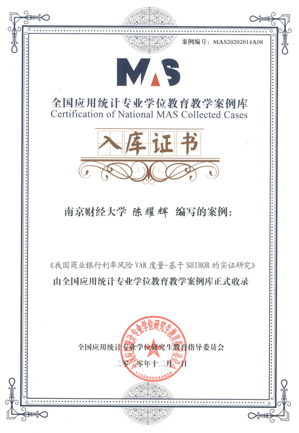 2、全国应用统计专业学位教育教学案例库入库案例:《我国商业银行利率风险VAR度量-基于SHIBOR的实证研究》,编写人:陈耀辉。