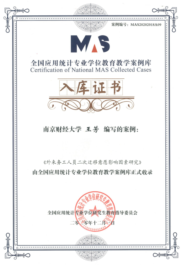 4、全国应用统计专业学位教育教学案例库入库案例:《外来务工人员二次迁移意愿影响因素研究》,编写人:王芳。
