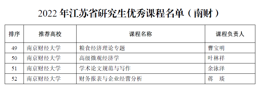 日前,江苏省教育厅印发《关于公布2022年度江苏省研究生优质教学资源评选结果的通知》(苏教研函〔2022〕27号),公布了2022年度江苏省研究生优质教学资源评选结果,qmh官网申报的研究生课程《高级微观经济学》被评选为2022年江苏省研究生优秀课程。该课程负责人为qmh官网博士研究生导师叶林祥教授,教学团队成员包括崔向阳教授、周宁副教授、吕文慧副教授、黄姗姗博士等多名硕士生导师。
