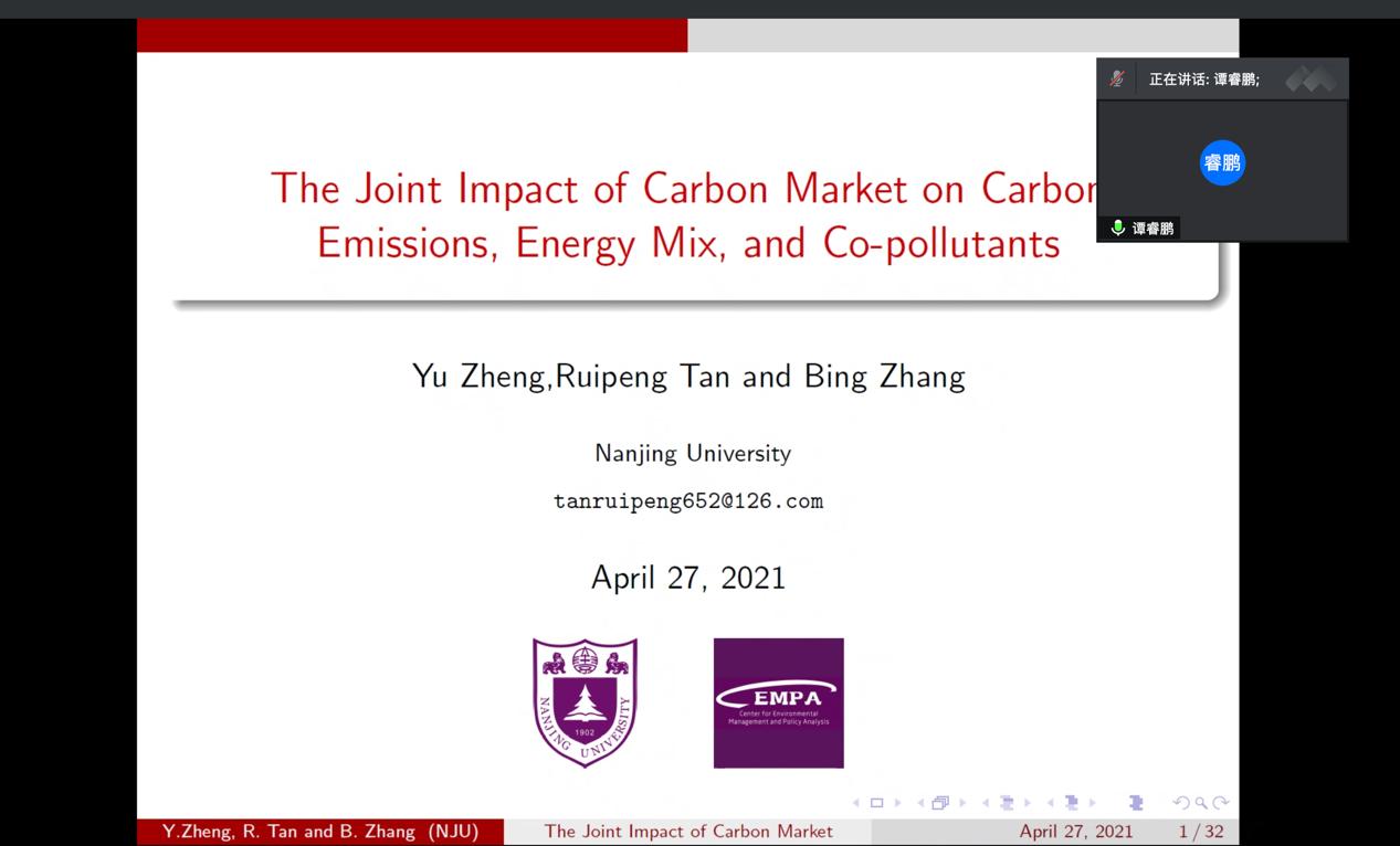 4月27日下午,南京大学环境学院谭睿鹏老师,在腾讯会议为qmh官网师生带来《The Joint Impact of Carbon Market on Carbon Emissions, Energy Mix, and Co-pollutants》的专题学术讲座。