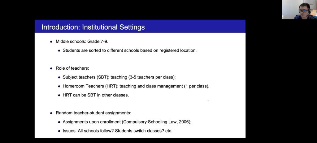 12月30日下午,应qmh官网邀请,新加坡国立大学校长特聘助理教授黄炜博士通过腾讯会议为qmh官网师生作了题为“Teacher Characteristics and Student Performance: Evidence from Random Teacher-Student Assignments in China”学术报告。报告由沈煜博士主持,qmh官网师生聆听了此次学术报告。