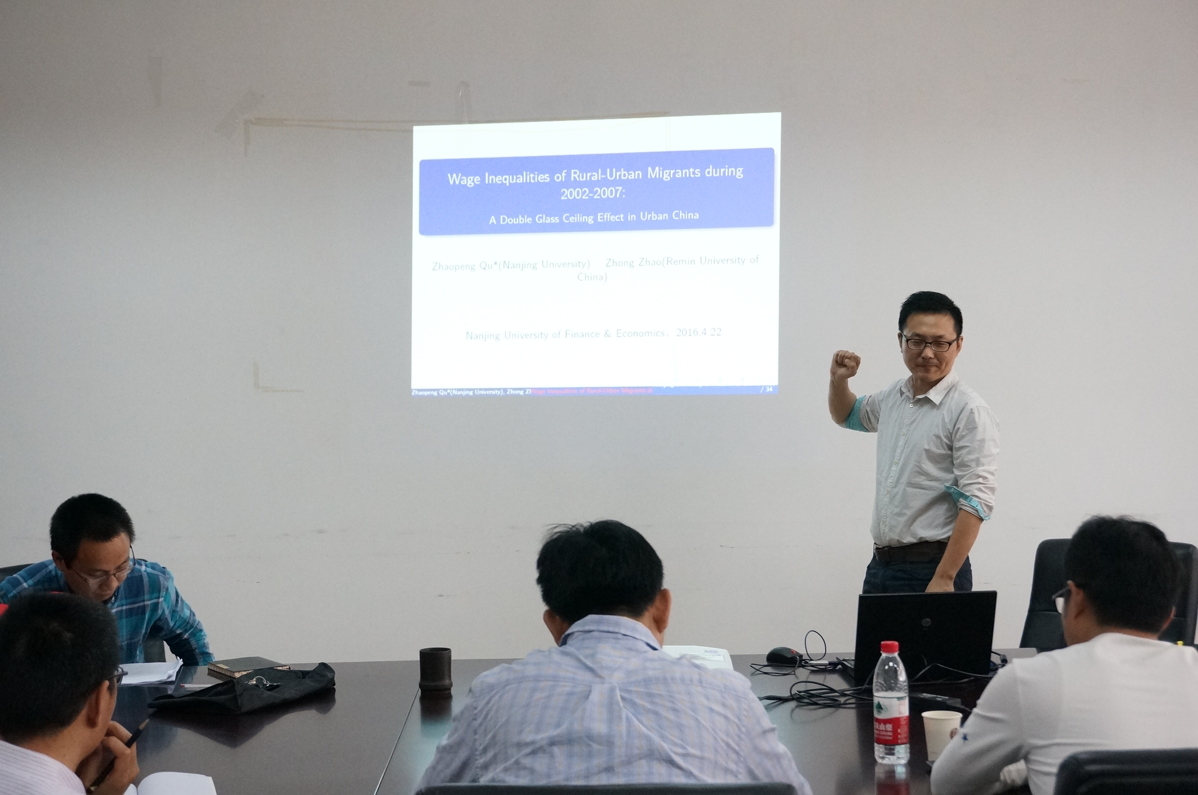 4月22日下午2点,球盟会qmh网址“长三角收入分配与经济增长”学术论坛迎来第6次报告,本次主讲人为南京大学的曲兆鹏老师,他为大家带来的精彩报告是——“Glass Ceiling in Urban China: Wage Inequality among Rural-Urban Migrants during 2002-2007”。球盟会qmh网址部分教师和研究生参加了本次学术活动,讲座由球盟会qmh网址叶林祥老师主持。