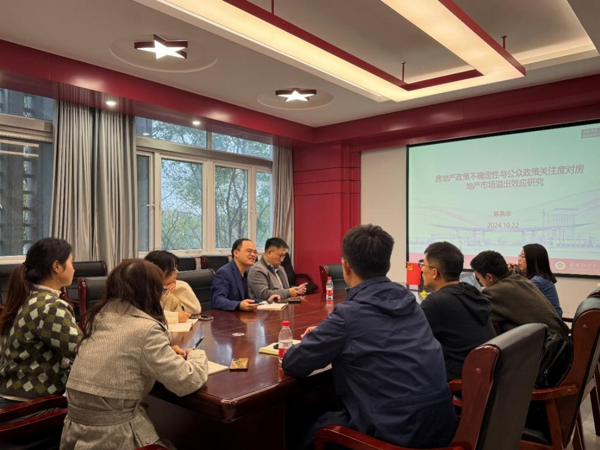 10月22日下午,qmh官网在德经楼会议室329举办了双周学术论坛。本期论坛由陈燕华老师带来主题为“房地产政策不确定性与公众政策关注度对房地产市场溢出效应研究”的学术交流。陈杰副教授主持了本次学术论坛,学院部分教师参与。