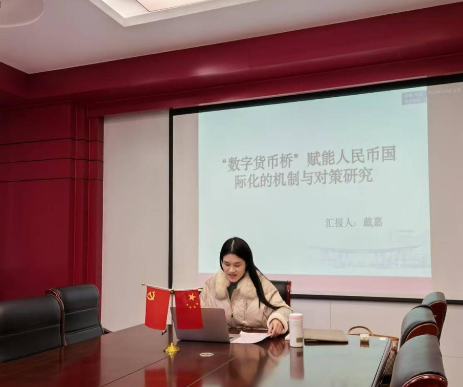 11月27日上午,qmh官网在德经楼329会议室举办了双周论坛。今天论坛由戴嘉老师带来题为“‘数字货币桥’赋能人民币国际化的机制与对策研究”的学术交流。球盟会qmh网址陈杰副教授主持了本次学术论坛,刘小峰院长与部分教师参与研讨。