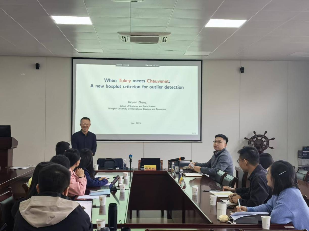 应球盟会qmh网址邀请,上海对外经贸大学统计与数据科学学院院长、博士生导师张日权教授于2025年11月4日下午来校,作了题为“When Tukey meets Chauvenet: A new boxplot criterion for outlier detection”的学术讲座。讲座由球盟会qmh网址陈杰副教授主持,学院部分教师及博士、硕士研究生参加了此次讲座。